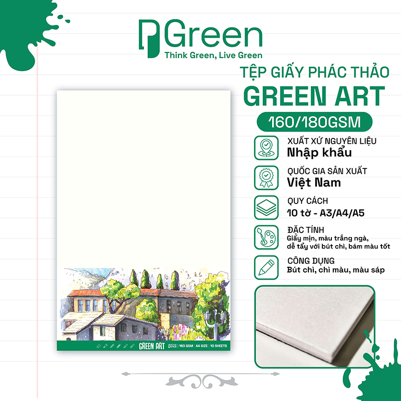 – Green Art – “Màu cỏ non dưới chân” – Là dòng giấy dành cho với học sinh, sổ tập vẽ cho người mới, mang lại cảm giác gần gũi và dễ sử dụng. Đây là nơi bắt đầu của những bước vẽ đầu tiên – nhẹ nhàng, chân thật và đầy cảm hứng.